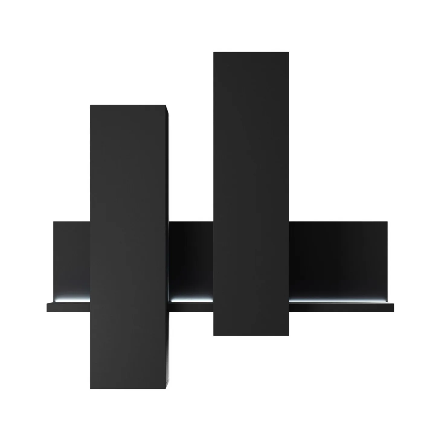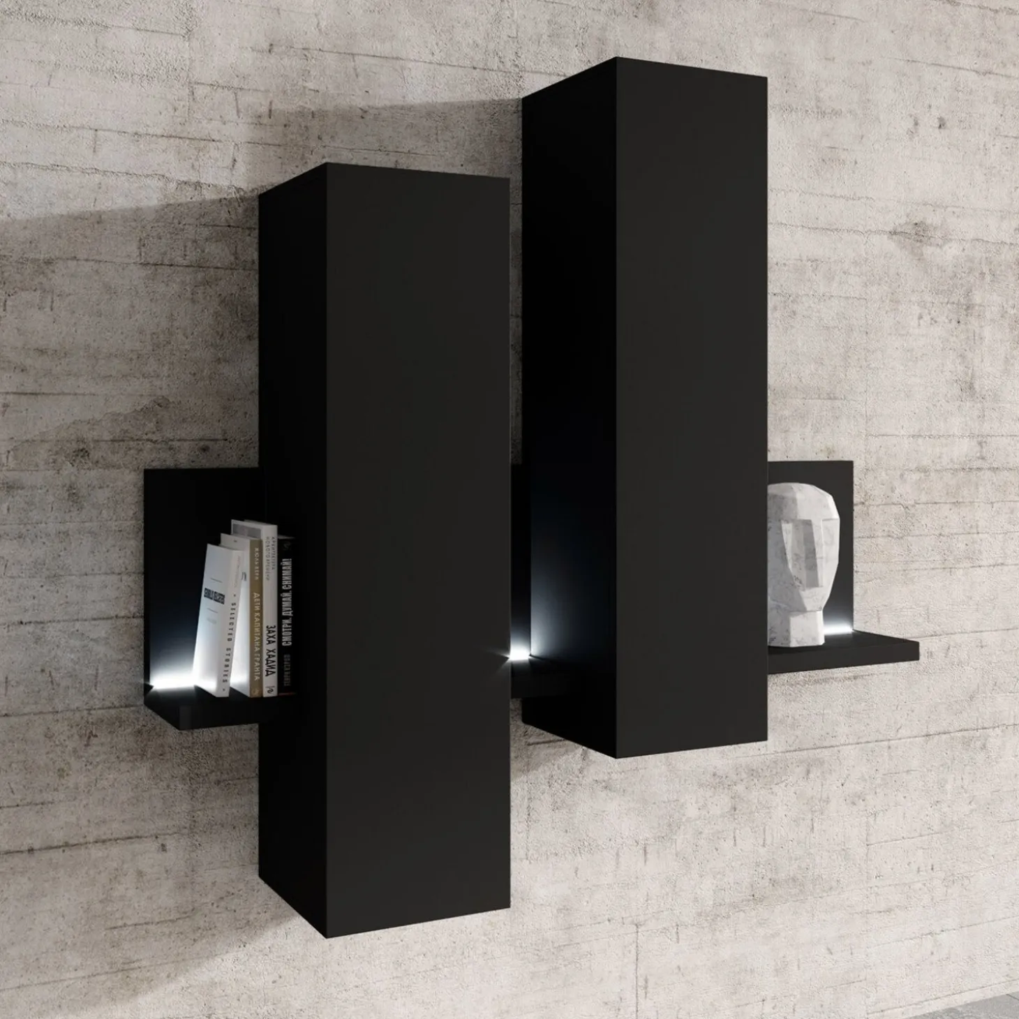 De wandkast Bologna in zwart heeft een strak en minimalistisch design met zwevende elementen en een speelse, asymmetrische indeling. De combinatie van gesloten kasten en subtiele plateaus zorgt voor een licht en modern geheel aan de wand.