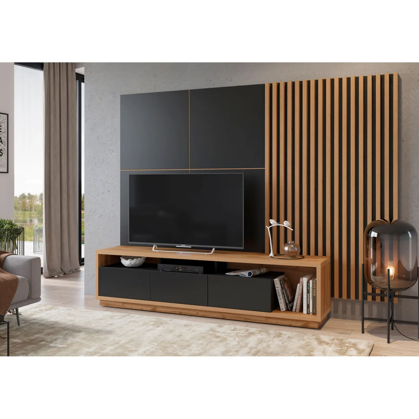 De vierkante opzet maakt dit paneel ideaal voor plaatsing achter een tv meubel of als zelfstandig design element aan de wand. De combinatie van lichte vlakken en warme accenten zorgt voor een stijlvol contrast zonder overheersend te zijn.